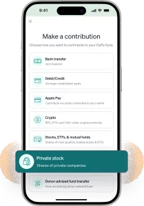 Even if private shares aren’t liquid yet, you can still donate them through a donor-advised fund (DAF) like Daffy. When you donate private stock to Daffy, the shares are not sold. Instead, the ownership of the shares is transferred to Daffy Charitable Fund.