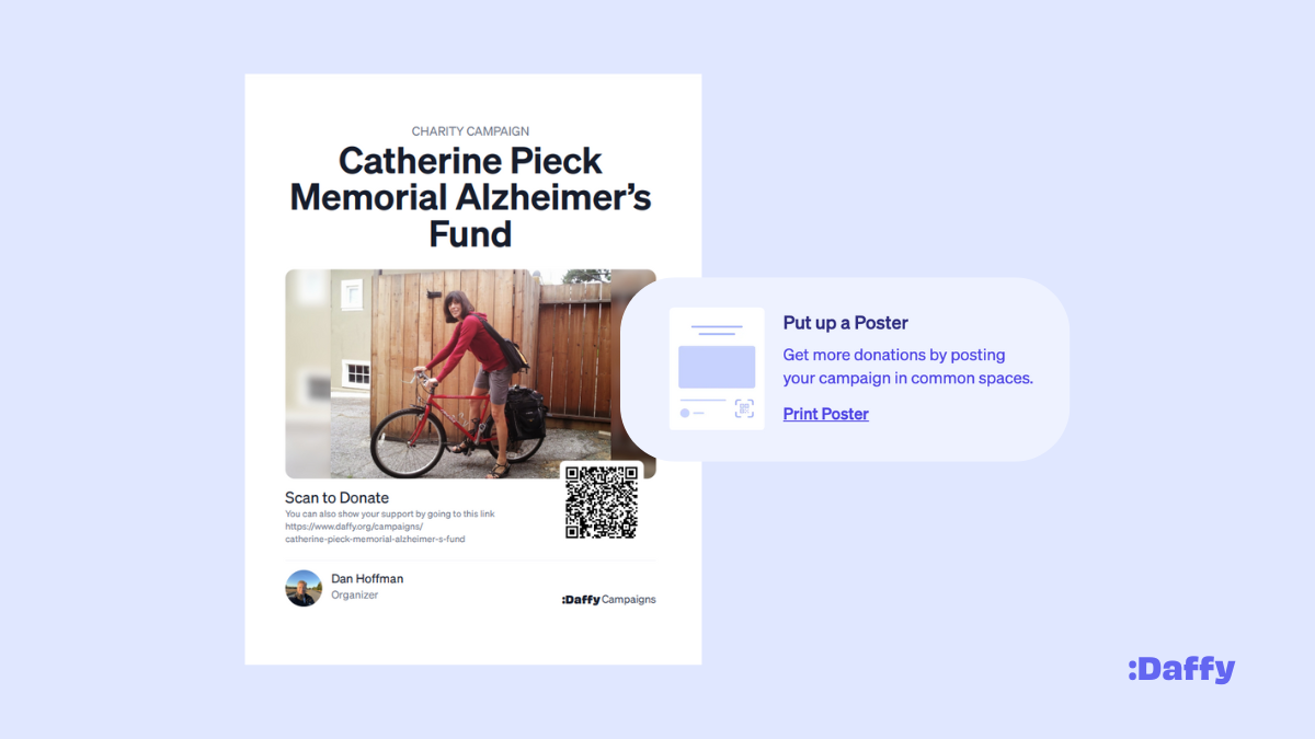 - The poster at Catherine's memorial service: “I had a memorial service at the house and just posted the poster up and sure enough, as people were walking in and out the door, they're making donations using the QR code while it's top of mind,” Dan shared.