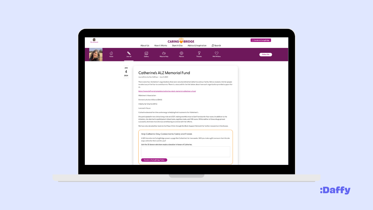 - Caring Bridge: Dan used a platform called Caring Bridge as a means to share updates on Catherine’s progression with friends and family, so he also used it to share the campaign in a journal entry.