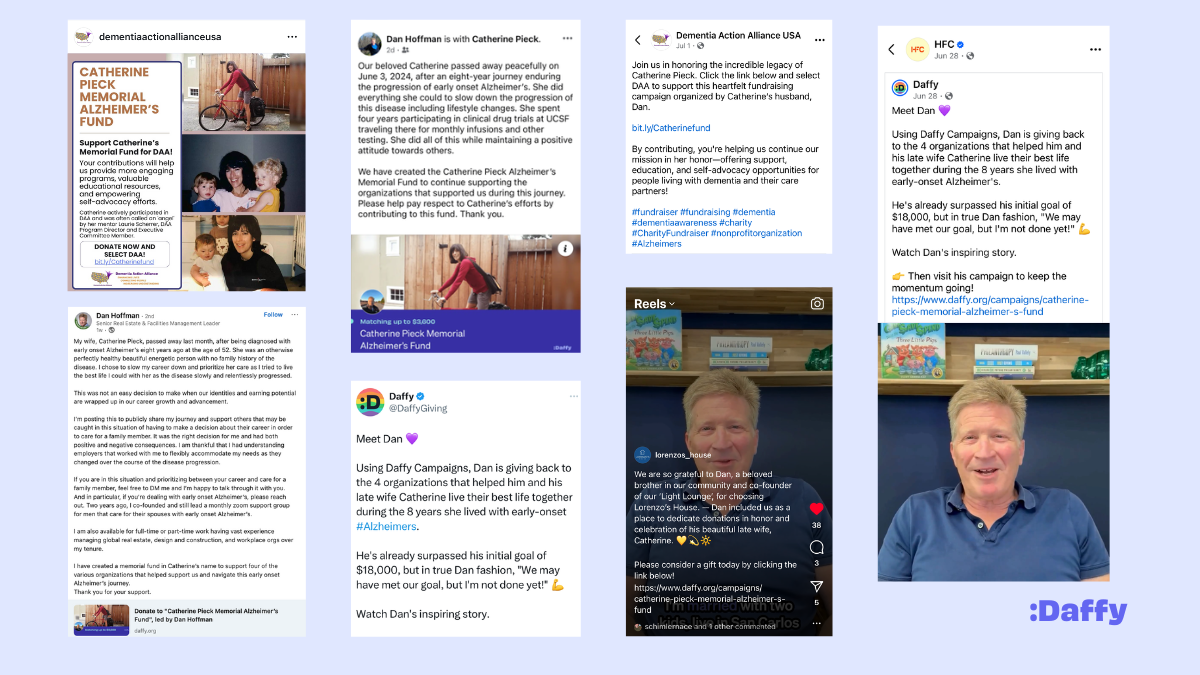 - Non-Profit Involvement: Another factor in Dan's successful campaign was his engagement with the non-profit organizations. Since Dan had existing, personal connections with each of the non-profits, he began his outreach by sending an email that detailed: how they’re connected, information about the campaign, his goals, and a clear ask to set up a 30-minute Zoom call to discuss how they could best support his campaign. This approach paid off, with organizations like Dementia Action Alliance, Hilarity for Charity, and Lorenzo’s House sharing the campaign.