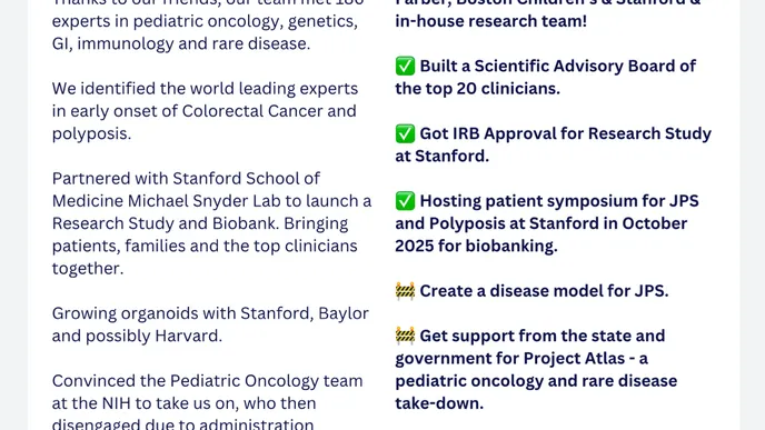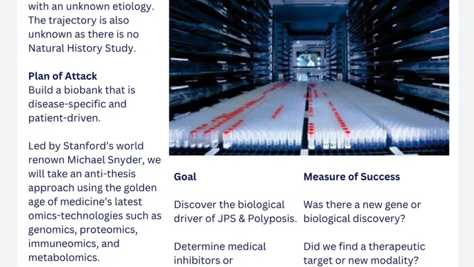 We are thrilled and grateful that Dr. Michael Snyder has moved mountains to stand up a research study and biobank for JPS and Polyposis at the Stanford School of Medicine. There is hype around all diseases being cured, but we need clean data, tied to clean phenotype, and the ability to run new technologies on this data with broad consent.