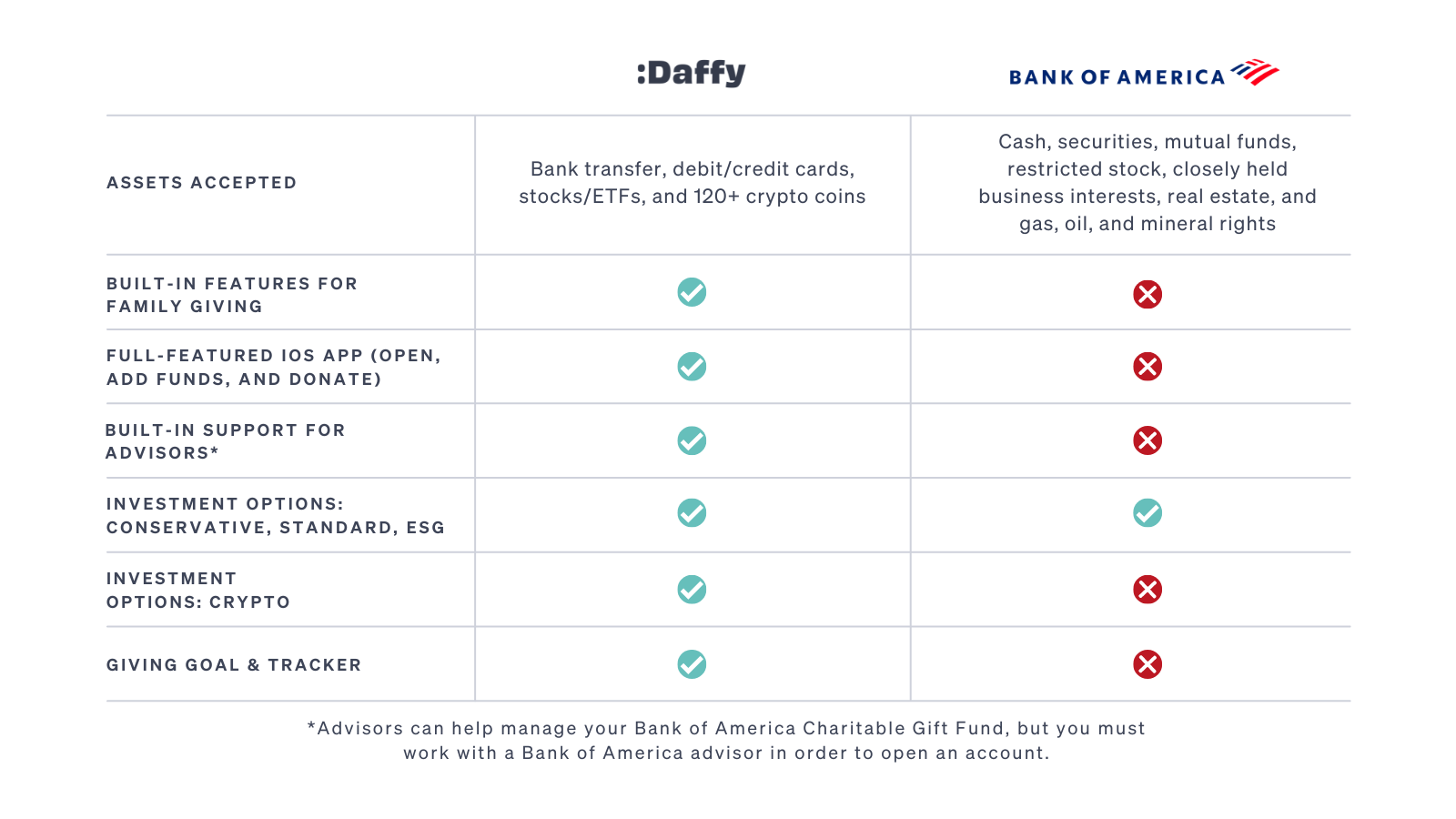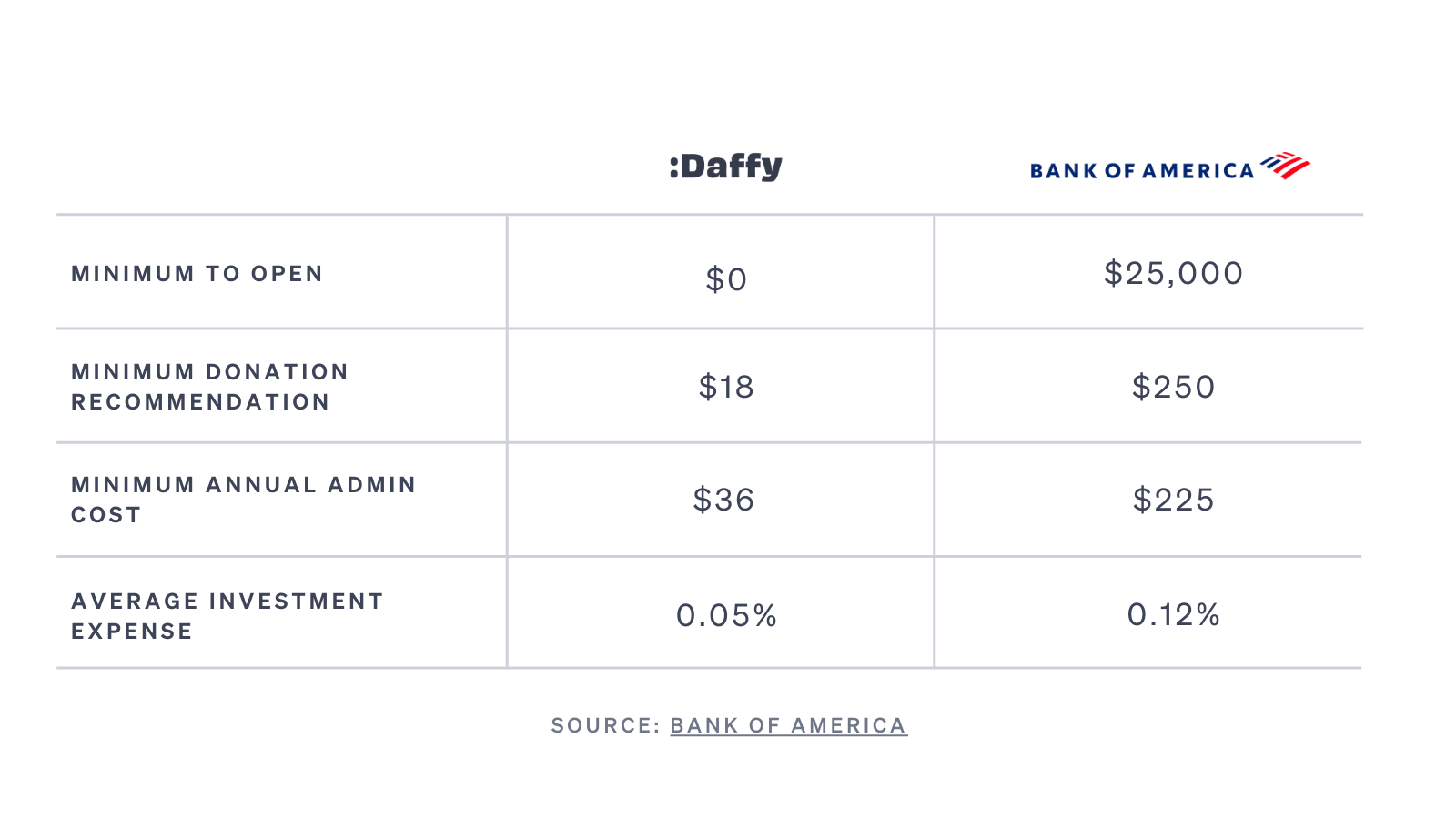 Here’s a side-by-side comparison of Daffy features versus the Bank of American Charitable Gift Fund.