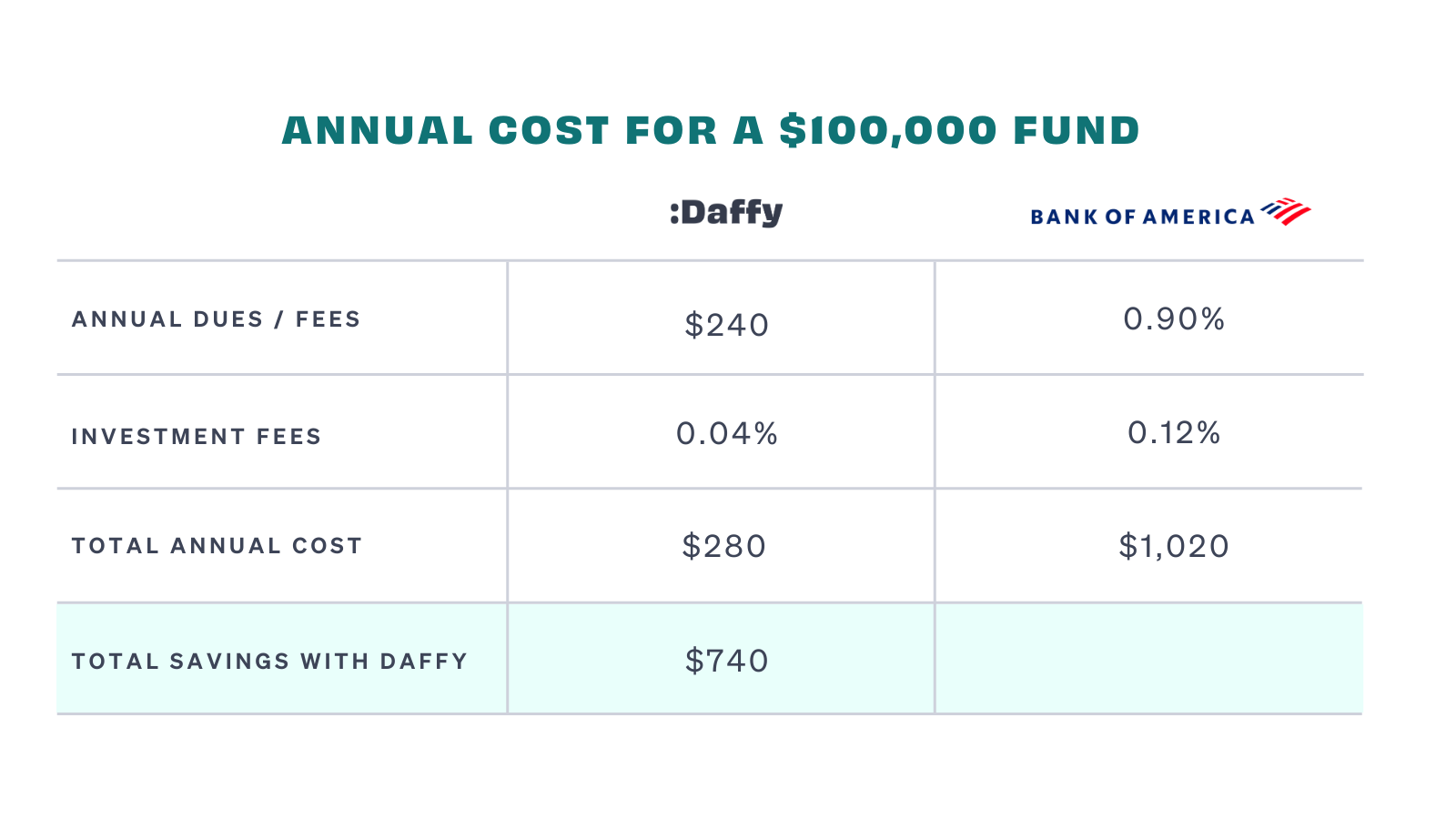 Unlike Bank of America, Daffy offers a low-cost membership for accounts of all sizes. Bank of America charges fees based on the account balance, which starts at 0.90% and goes down to 0.10% as you contribute more. But even at the 0.10% fee level at $100,000, that adds up to $740 more each year in fees. Compared to $240 per year with Daffy, that saves you $500 per year.