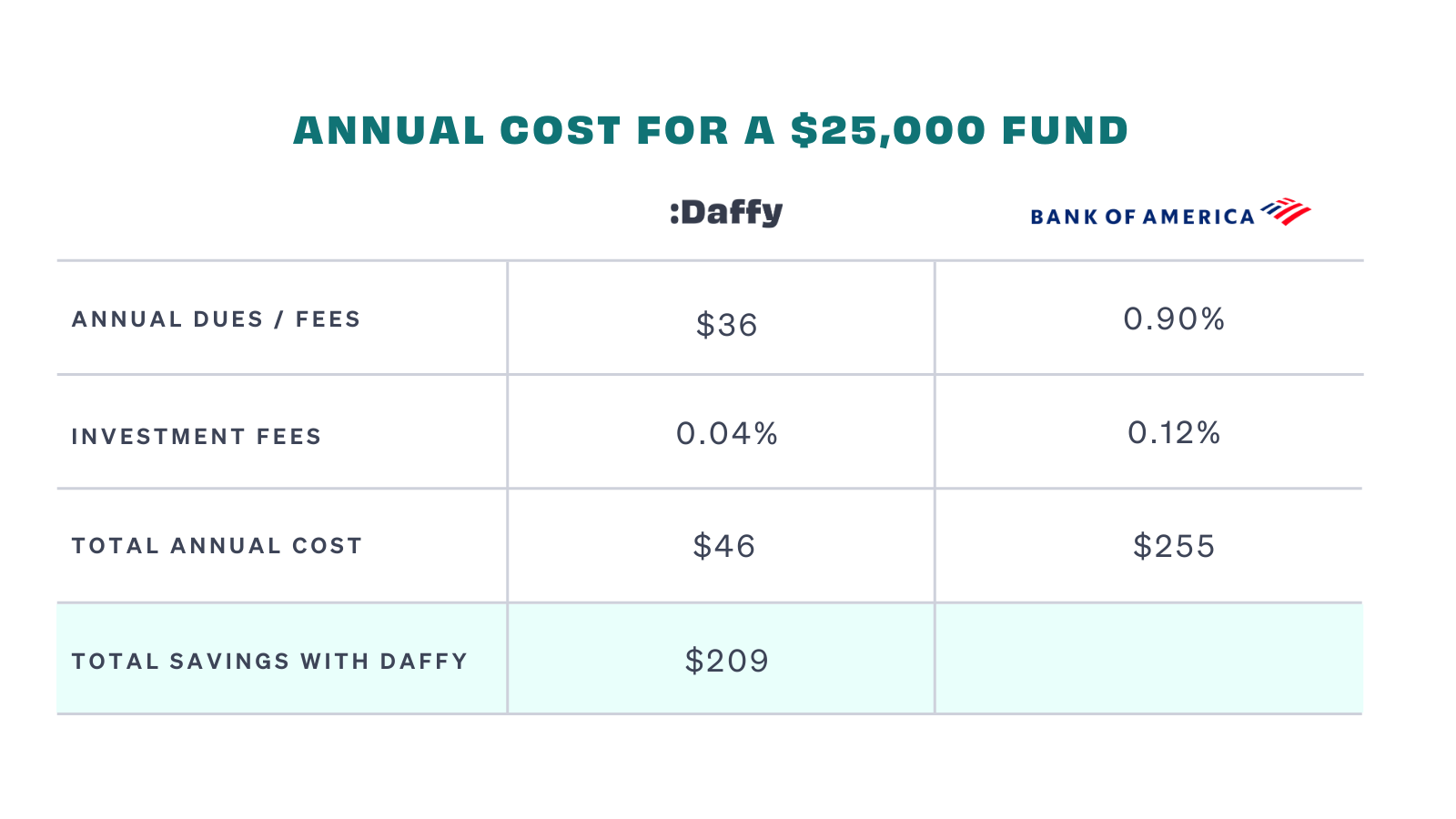 Daffy and Bank of America are worlds apart when it comes to funding accounts and charging fees. For starters, there’s no minimum contribution with Daffy; but with Bank of America, you’ll need $25,000 to open your account. After that, your fee varies based on your balance. The lowest cost is reserved for account holders with the largest balances.