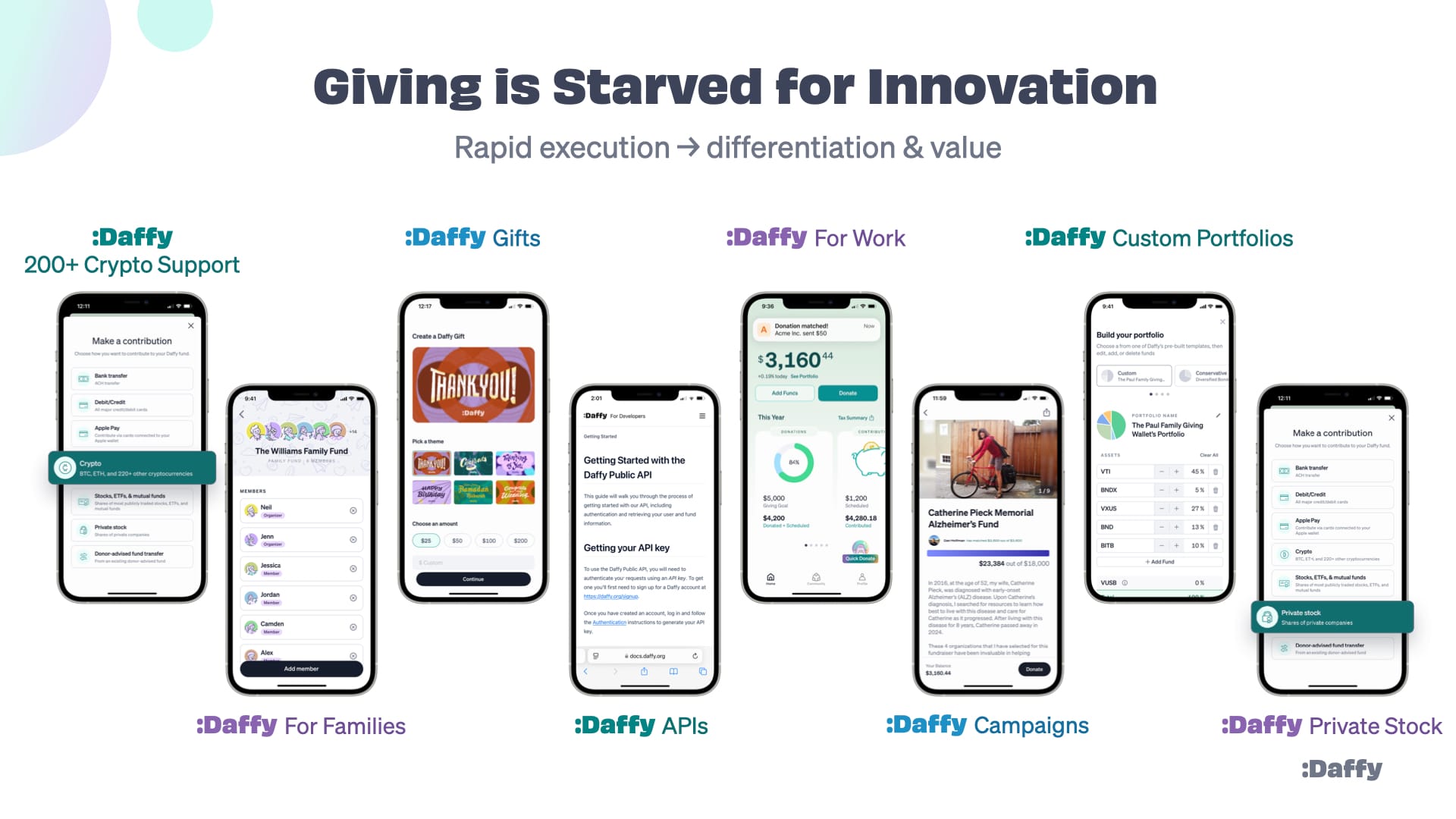 Since then, Daffy has really proven how much room for innovation in this historically slow-moving category. In the time it took Schwab Charitable to execute a rebrand, Daffy has launched more new features in the last few years than the industry has collectively implemented in the last few decades.