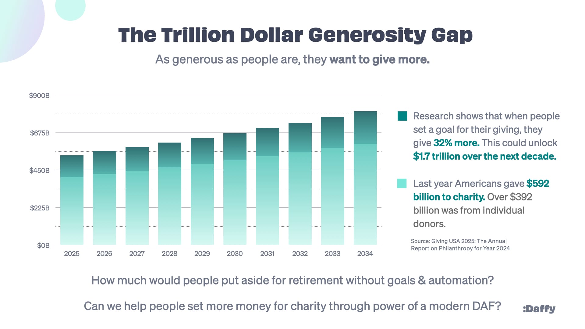 Our goal was fairly audacious. Like most organizations in this sector, we knew that charitable giving was already huge in the United States — over $592 billion in 2024 alone. But as big as that number was, Daffy is the crazy company that believed it could be even bigger.