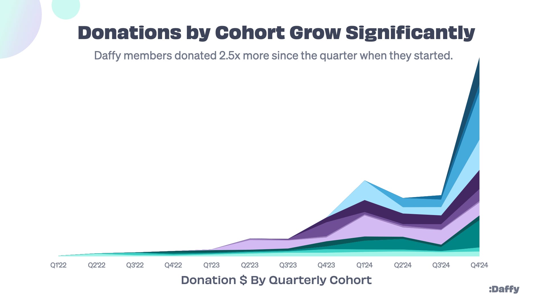 When we track the giving of Daffy members based on when they joined, we see the same pattern in every quarterly cohort. Daffy members join, they contribute more and more over time, and they donate more and more over time. And if you look at every quarterly cohort since Q1 2022, on average their donations increased from their first quarter by over 2.5x by Q4 2024.