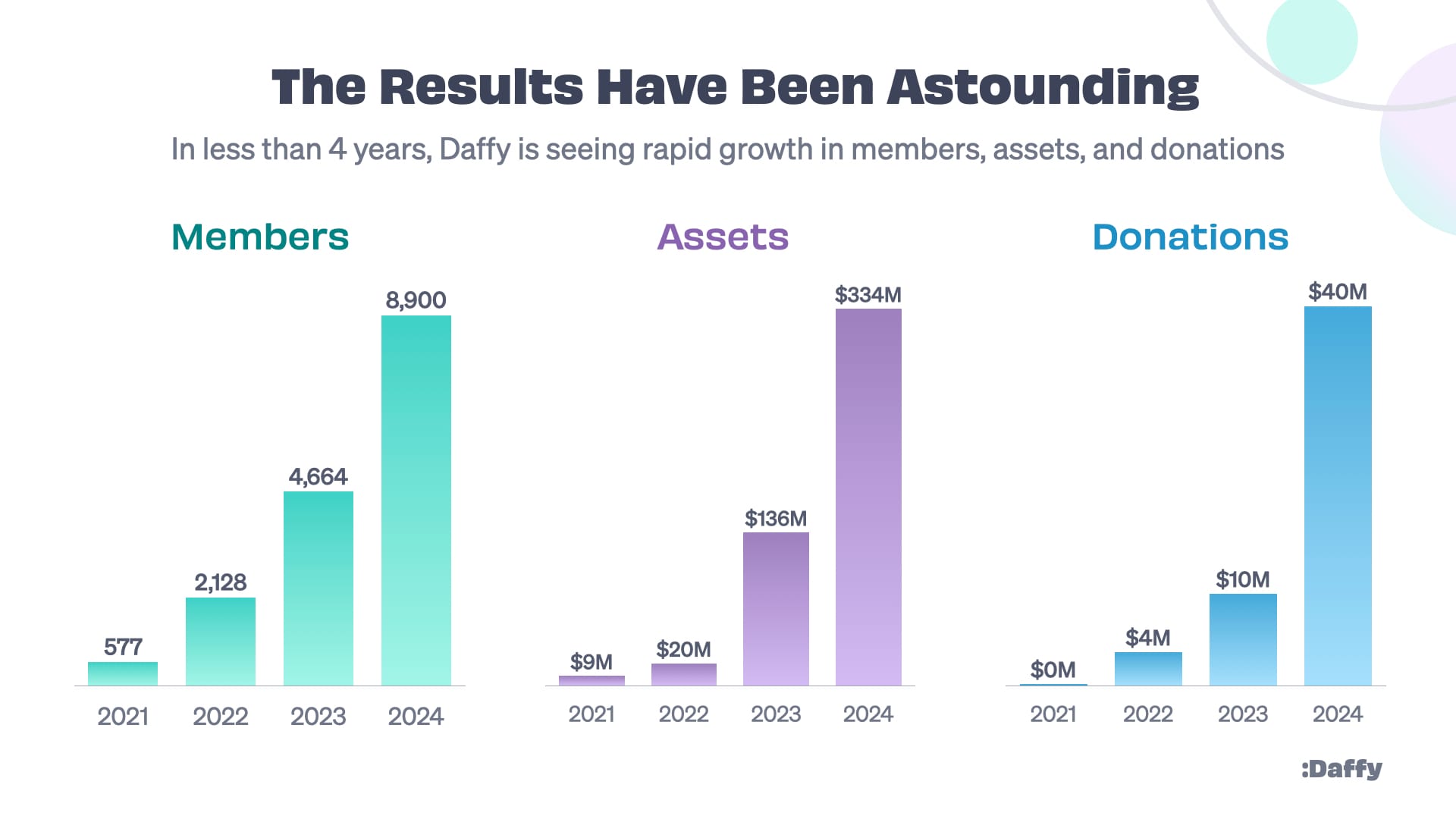 By putting these new, innovative features in the hands of our generous members, Daffy has been rewarded with rapid growth. At the close of 2024, Daffy had achieved a 100%+ compounded annual growth rate (CAGR) in members, a 200+% CAGR in assets, and an astounding 300+% CAGR in donations.
