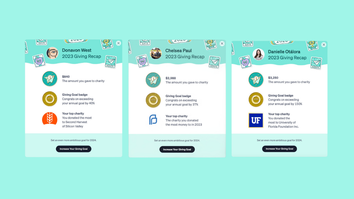 Earlier this month, we released personalized 2023 Year in Review recaps for each of our members—highlighting the amount they gave, if they hit or exceeded their giving, and their top charities. If you’re a member of Daffy, you can see your recap at daffy.org/home/giving-recap-2023.