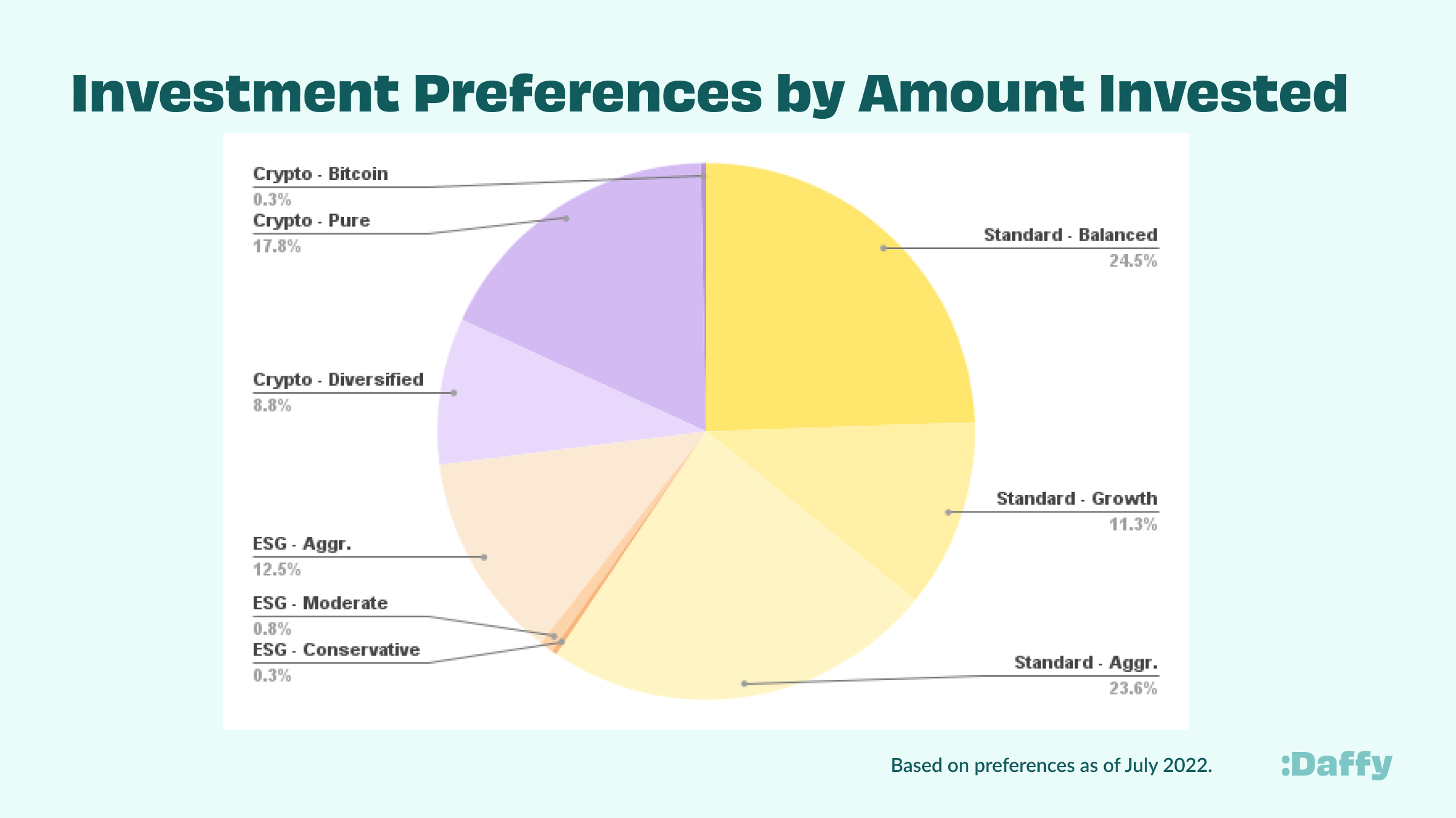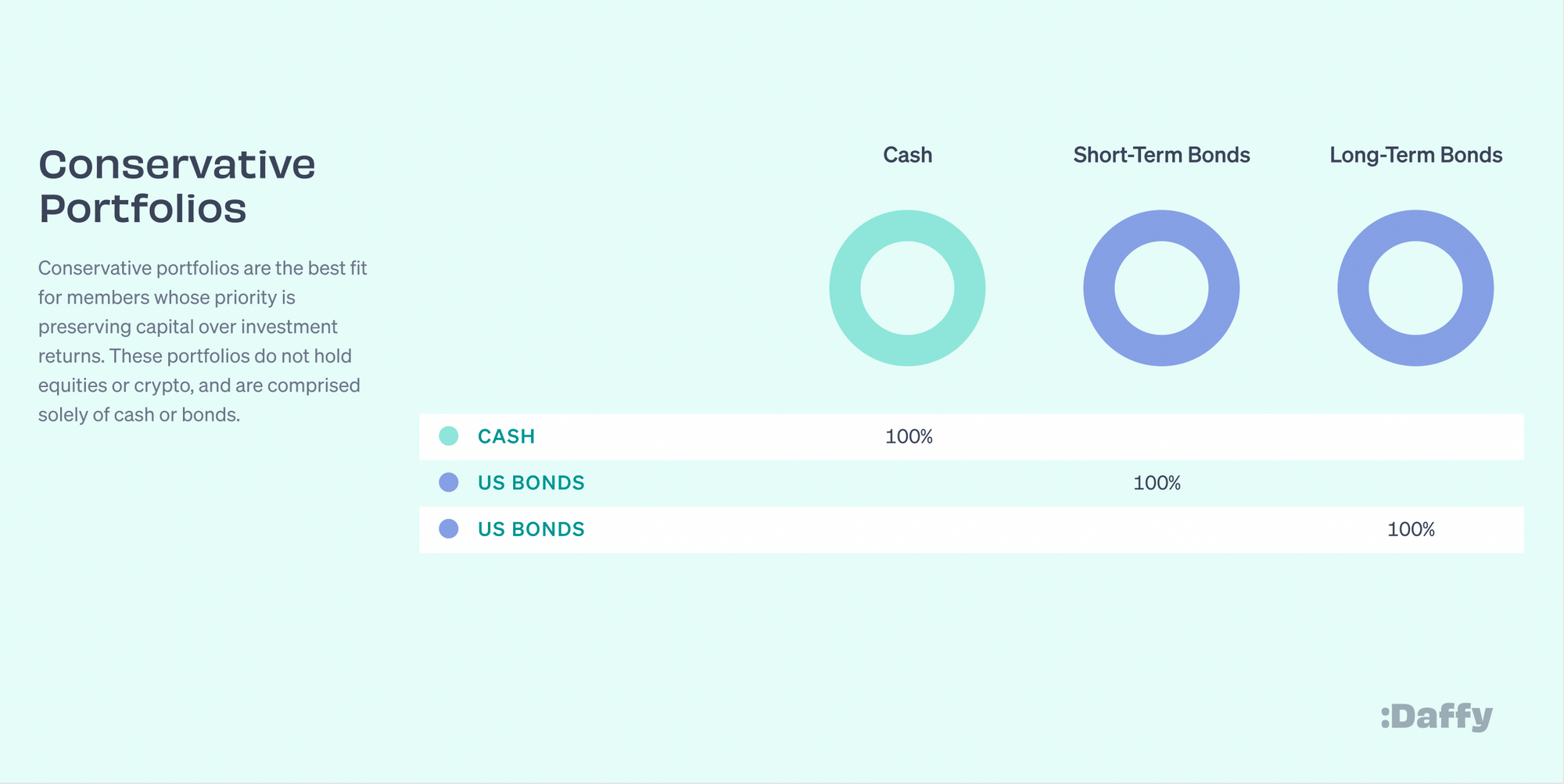 So whether you are looking for a conservative portfolio of cash or bonds, a standard portfolio of low-cost index funds, ESG portfolios that reflect your values, or modern crypto portfolios, you can find the right fit for your contributions at Daffy.