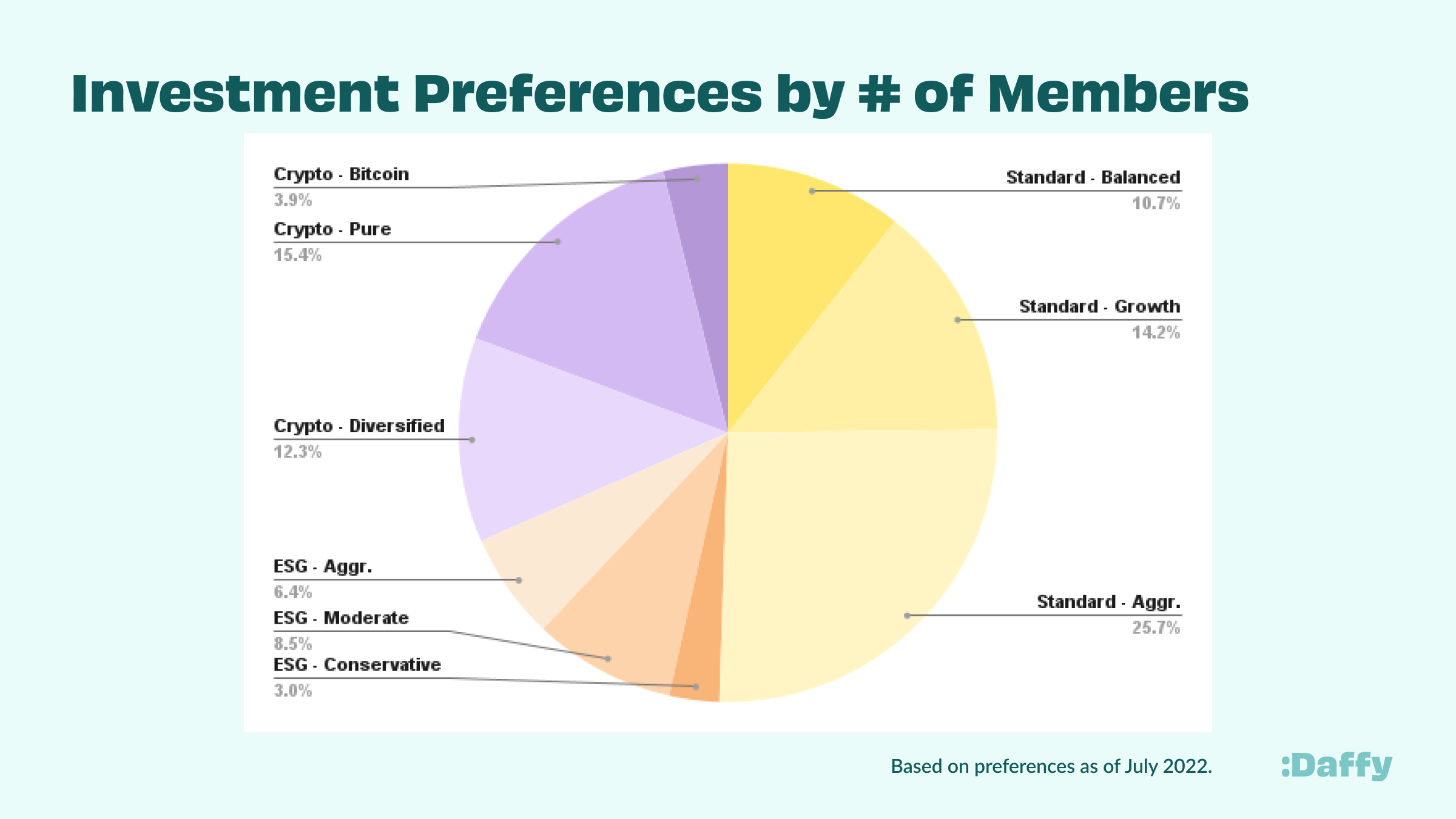 Members of Daffy can now select across four types of portfolios: Conservative, Standard, ESG, and Crypto. Daffy, unlike most existing donor-advised funds, does not make additional revenue from the investment portfolios held by the fund. As a result, we’re free to construct each portfolio from the investments that best suit our members’ different charitable objectives.
