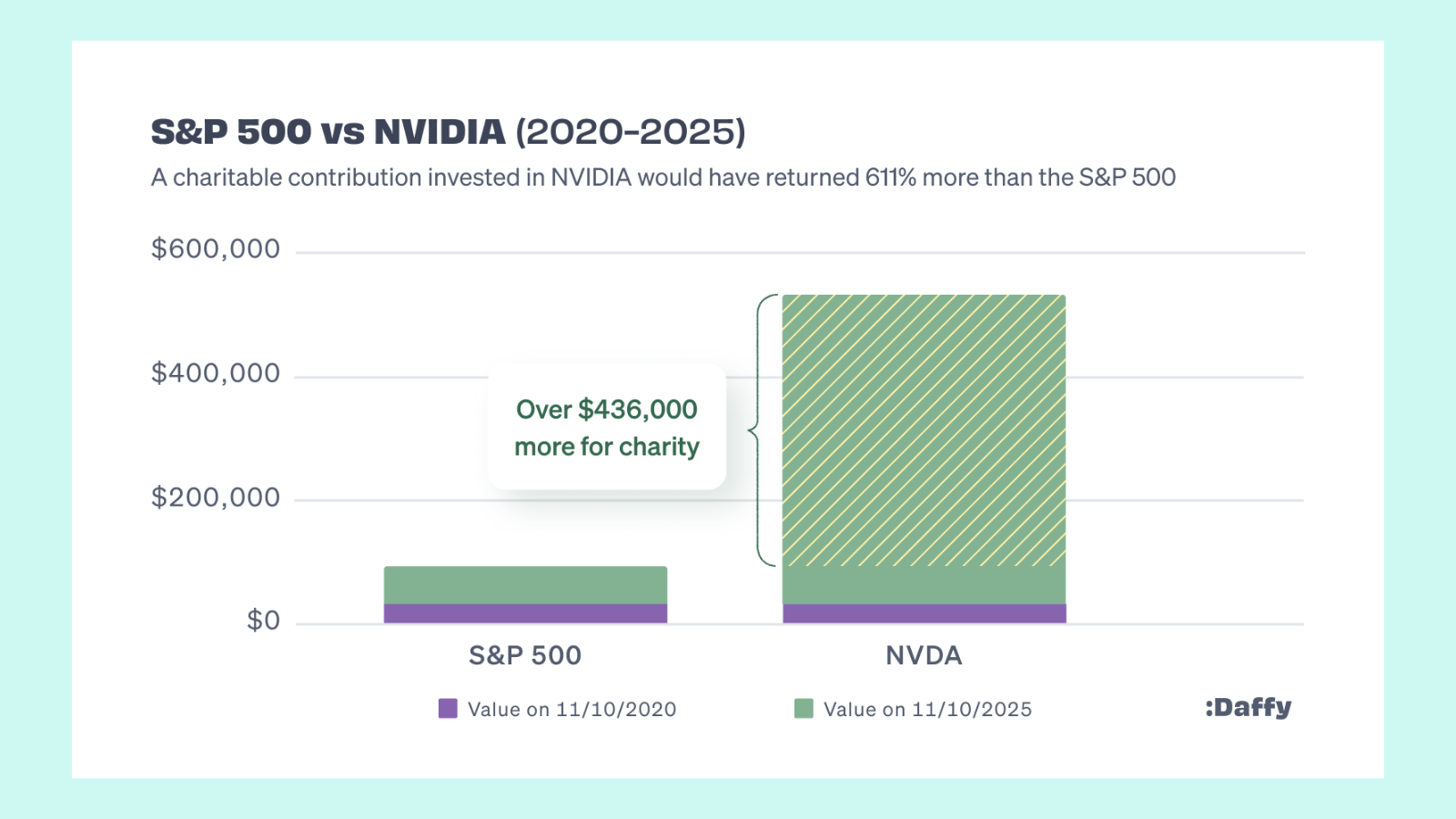 If an Nvidia employee had put aside 2,500 shares of stock for charity five years ago, they would now have over $436,000 to donate. Unfortunately, if they had made that contribution to a donor-advised fund at Fidelity, Schwab, or Vanguard, that stock would have been liquidated immediately. Most of those potential gains would have been lost.