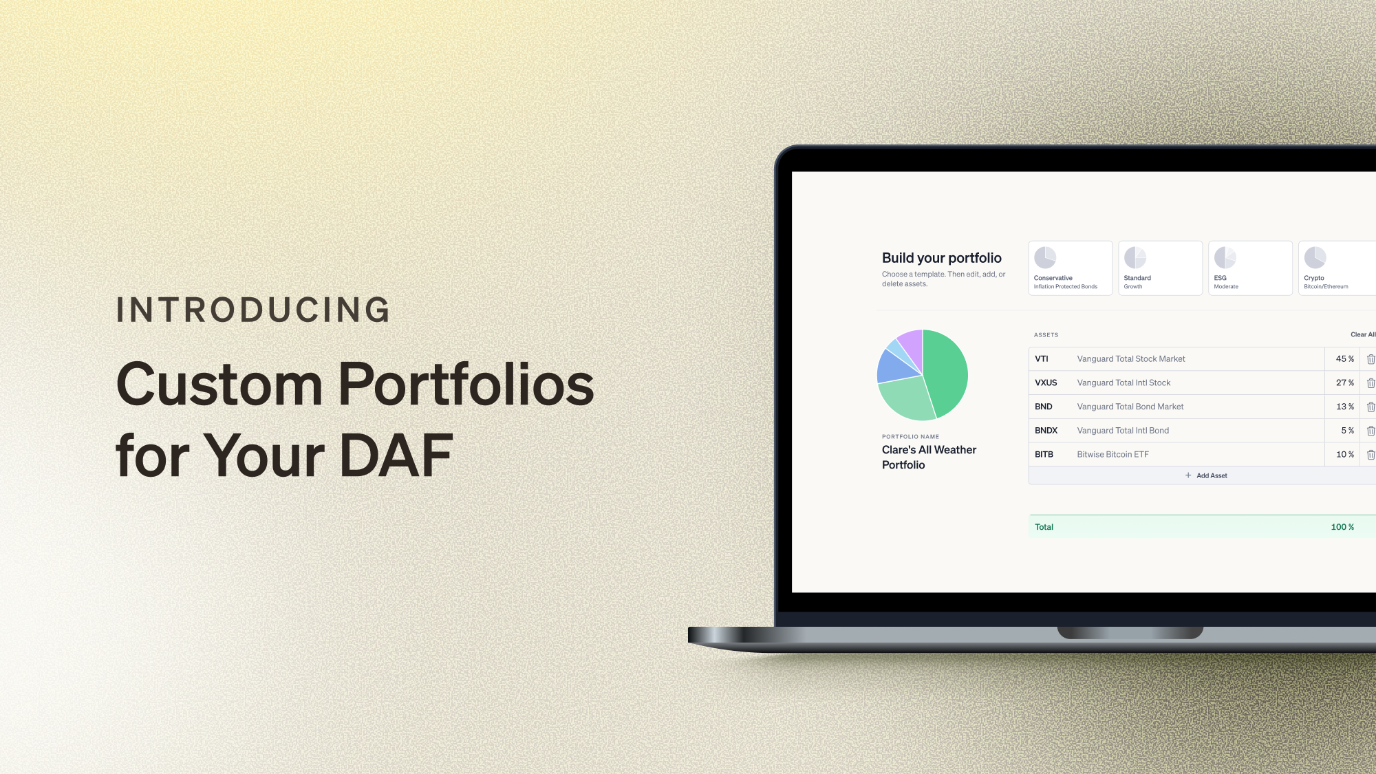 With the addition of custom portfolios, we believe that we will unlock even more giving. Whether you manage your donor-advised fund directly or with the help of a financial advisor, we’re excited to see our members better align their funds with their giving goals.