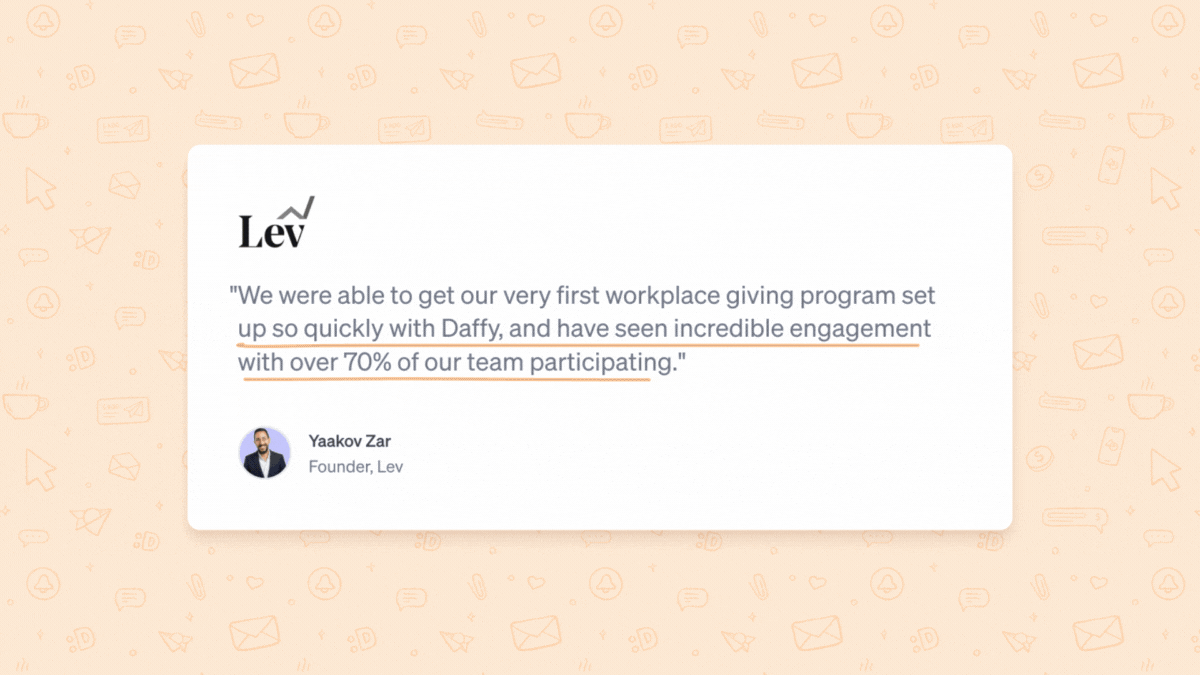 Join the ranks of modern companies like Acorns, Lev, OpenAI, Titan, and XYZ, who have already embraced Daffy for Work. To make it easy to share within your organization, we have prepared this email template for you to introduce Daffy for Work to your HR team and help foster a culture of giving and philanthropy within your own workplace.