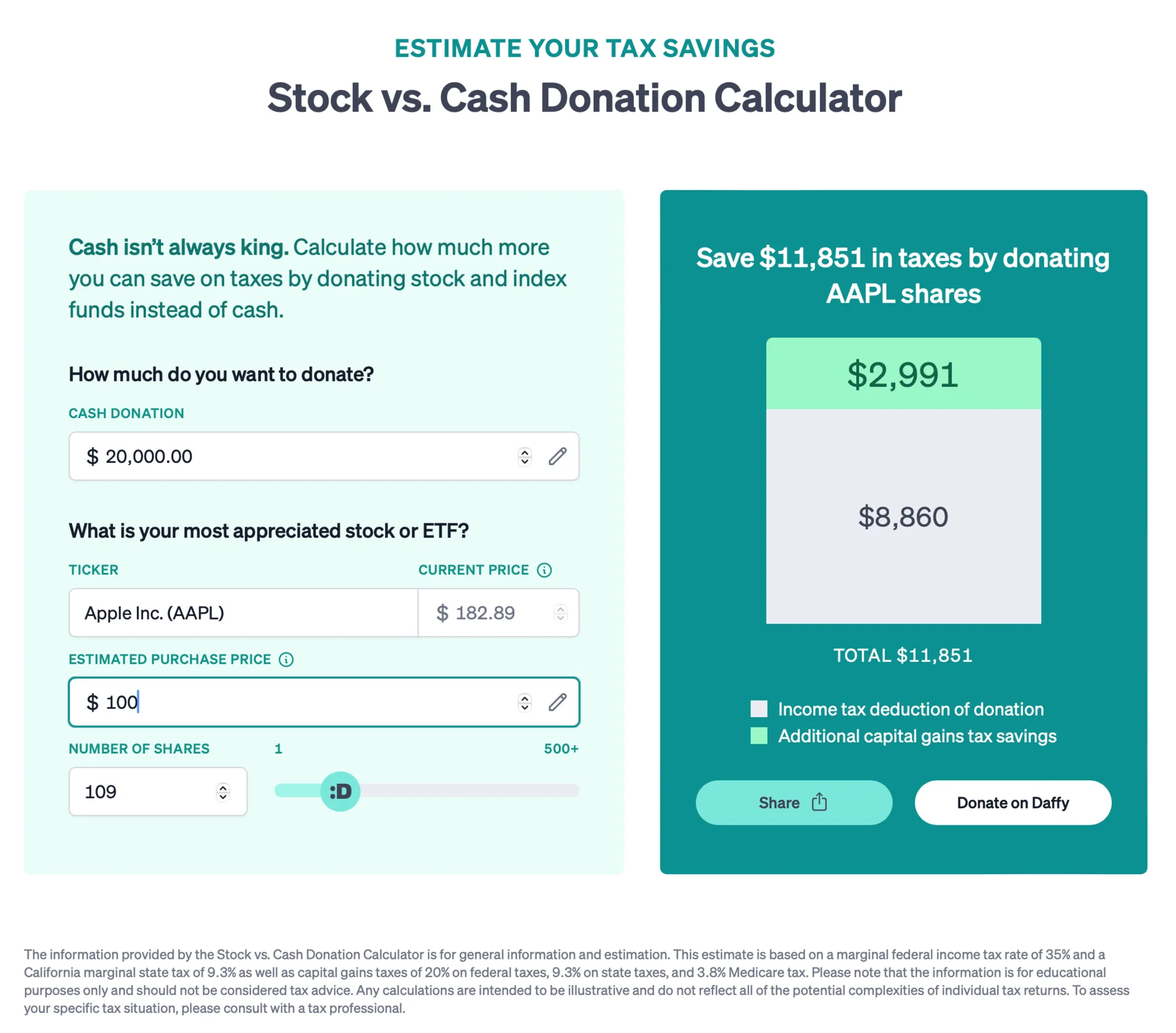 Daffy has a free, simple calculator that lets you calculate the tax savings for donating any publicly traded stock or ETF vs. cash.