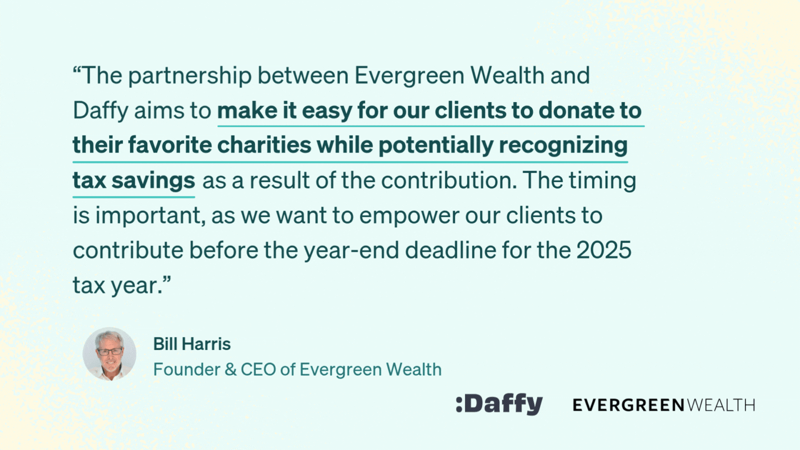 “We’re committed to helping Evergreen Wealth clients build long-term wealth for themselves and their families,” said Bill Harris, founder and CEO of Evergreen Wealth. “The partnership between Evergreen Wealth and Daffy aims to make it easy for our clients to donate to their favorite charities while potentially recognizing tax savings as a result of the contribution. The timing is important, as we want to empower our clients to contribute before the year-end deadline for the 2025 tax year.”