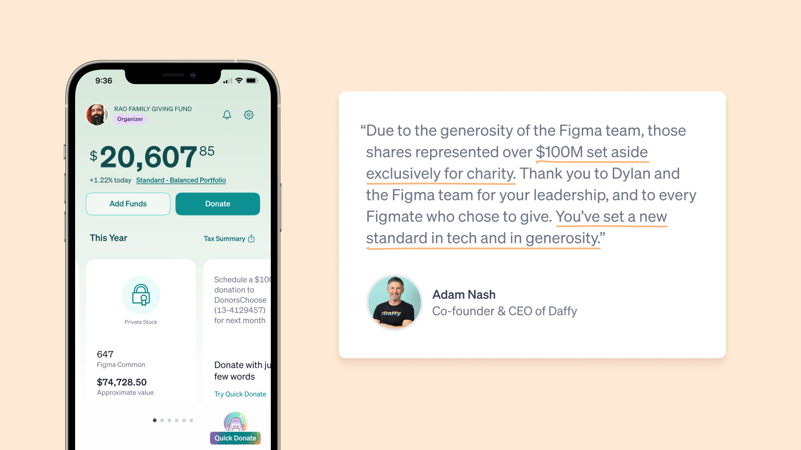 Daffy’s Private Stock Donation Program is now live and available to any late-stage venture-backed private company looking to emulate Figma’s success. With full support for stock administration tools like Morgan Stanley’s Shareworks, Daffy provides the only platform that can scalably open up private stock donations to an entire company.