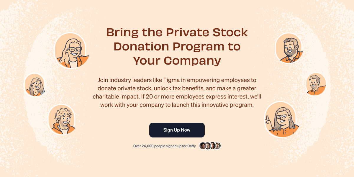 Getting started is simple. You can learn more about unlocking private stock for charity and supporting your employees through the Daffy Private Stock Donation Program.