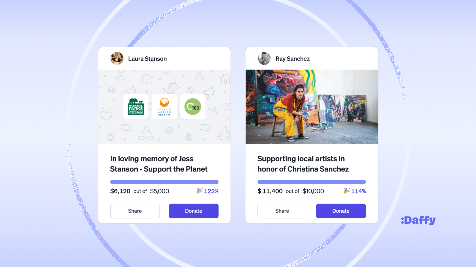 Consider starting a fundraiser to support a cause or charity that holds special significance to your loved one. Whether they were passionate about environmental conservation, the arts, or their place of worship, directing donations toward their chosen organizations is a heartfelt way to continue their philanthropic legacy.A unique element of Daffy Campaigns is that you can select up to 6 charities, so if your loved one supports multiple organizations for a cause like environmental conservation or has a variety of philanthropic interests you can select more than one charity.