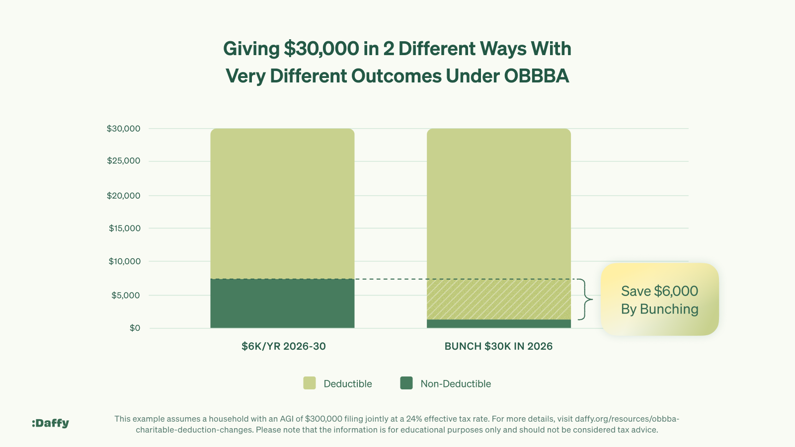 To illustrate, let's look at another sample household, the Bunchy family. While the Bunchy family has the exact same income and annual giving as the Steady family, they use a DAF to manage their giving. Instead of making $6,000 worth of donations every year directly to charities, they contribute five years' worth of giving at a time into their DAF.
