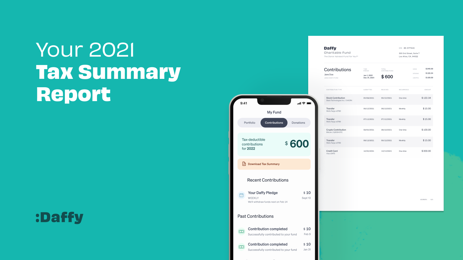 If you’re a member of Daffy, you can view and download your Tax Summary report under the Contributions tab in your “My Fund” section in the Daffy app or by logging in on daffy.org.