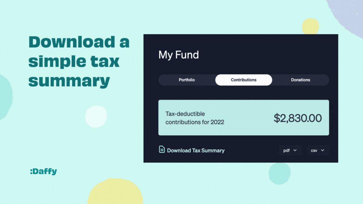 In addition to the ability to download a PDF, you’ll now easily be able to consolidate your tax deductions from Daffy with any existing spreadsheets your accountant or you are managing for tax or other tracking purposes.