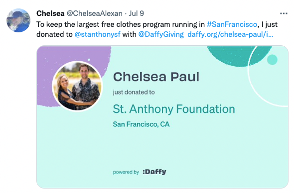 After every donation on Daffy, you’ll have the ability to share a personalized graphic highlighting your donation, so you can easily encourage friends and followers to join you in raising funds for the charities you love.
